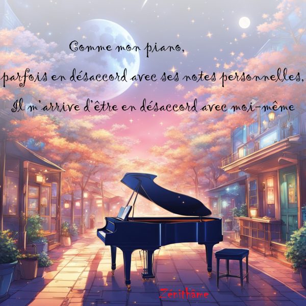 Maxime: Comme mon piano, parfois en désaccord avec ses notes personnelles, il m’arrive d’être en désaccord avec moi-même.