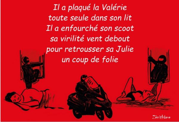 Maxime: Il a plaqué la Valérie toute seule dans son lit. Il a enfourché son scoot, sa virilité vent debout, pour retrousser sa Julie, un coup de folie!