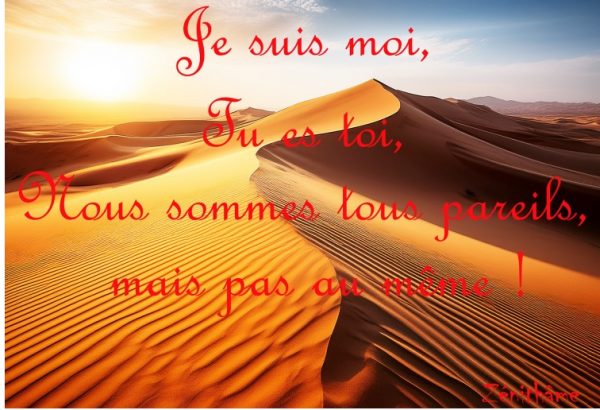 Être soi ne nie pas l’autre. Dire dans cette maxime : « Je suis moi, tu es toi », c’est affirmer l’existence légitime et incontestable de chaque conscience, de chaque vie. Nul ne peut prétendre incarner une norme universelle de l’humain. La dignité humaine repose sur la reconnaissance mutuelle : Je te reconnais comme un autre moi-même…